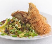 Chef Maria Elia is always creating stunning veggie mains. This one involves wrapping wedges of fried aubergine in ‘kataifi’, a sort of shredded filo pastry popular in southern Europe and Asia. Here honey is both mixed with harrisa to make a marinade for the veg, and used in the homemade dressing.