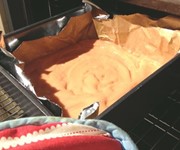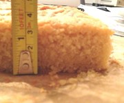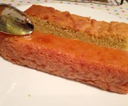 Apricot jam is your glue. You’ll need about half a jar of the stuff; heat it in a saucepan or the microwave so it thins out a bit. Sandwich one yellow cake strip together with one pink strip, using the jam as adhesive (you can apply it either with a teaspoon or a pastry brush). Slather the top of this layer in jam, then top it with another two cake strips, making sure you create a checkerboard effect.