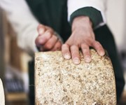 Once I’ve chosen which cheese to sell next, the selected one will then be ‘broken down’. This involves stripping off the cloth binding and cutting the cheese into attractive pieces of manageable size to allow 250g portions to be easily cut from them.