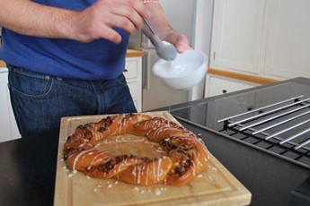 While my couronne was cooking I made my icing, then after 20-odd minutes I deemed it ready. This was shorter than the cooking time stated in the recipe, but then sometimes religiously following a recipe rather than using your senses can make things worse. Time to glaze and ice it. We didn't have any apricot jam in the kitchen, so I used lemon marmalade, which gave the required sheen, and if anything a more citrussy note.