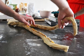 Now the tricky bit: the roll. There was some discussion about 'tacking down' and such, but actually the dough was pretty resilient and I managed to get it all rolled up into a sausage about 1.5ft long. After cutting down the length of the roll I platted the two strands, and sort of squished the ends together. This gave me a nice exposed interior, so hopefully I wouldn't suffer the fate of Christine. All the time I was doing this, Kimberley adopted the role of producer Tallulah Radula-Scott, who walks around between takes asking probing questions that fill your heart with doubt and fear.