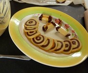 I rushed a second batch, messing up my concentric circle decorations as I went, and this time I painted my greaseproof paper with lashings of butter. But although they didn’t stick, the resulting tuiles were still too thick, and so I had trouble moulding them around my rolling pin and wooden spoon handle. Plus that failed first batch left me lagging, and I only managed nine tuile discs and three droopy-looking cigars by the end of play. Comparing them to the attempts on Tuesday night’s Bake Off, they were nowhere near as good as Christine’s, but perhaps a slight improvement on poor Howard’s.