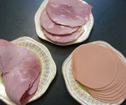 So we went out and bought three types of meat (ham, sausages and chicken) in three different guises (low budget meat, higher-end meat and a veggie version). Surprisingly, we couldn't find a veggie bacon locally.