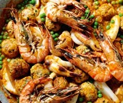 Chef Rick Stein on his one-pan seafood dish: “I’ve used mostly cuttlefish, a seafood that is still very good value for money. I find that minced chicken and pork meatballs and the cuttlefish go well together. This dish isn’t always garnished with prawns but I love the colour they add.”