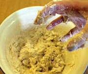 Tip the flour into a large mixing bowl. Add the salt to one side and the yeast to the other, which is important because the salt can retard the yeast. Add the butter and three-quarters of the water. Turn the mixture around with your fingers using a ‘claw hand’.