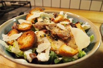 Unsurprisingly, the original would have been a much simpler entity than that of today. The (now essential) inclusion of anchovy is a modern addition, for example, as are the chicken, bacon, capers, tomatoes and whole host of possible extras. With modern day concerns about salmonella, not to mention our preference for food that is quick and easy, substitutes for the coddled egg dressing base described by Julia Child have come in: “I remember most clearly ?the eggs going in, and how he tossed the leaves so that it looked like a ?wave turning over.” Jamie Oliver recommends crème fraiche (which I prefer, with a little mayonnaise, in my recipe) and Sam Stern uses yoghurt in his new book Virgin to Veteran.